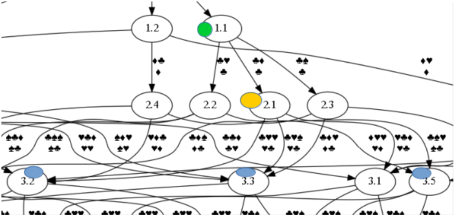 The game starts expanding, then contracting until “the big squeeze” in level 5, after which two end nodes become the most likely outcomes (render in matching colors) until the end in level 10. From level 5 to 10 is fine tuning and negotiation although switching to other pairs is possible if lots of resources are involved (not pictured in the example).