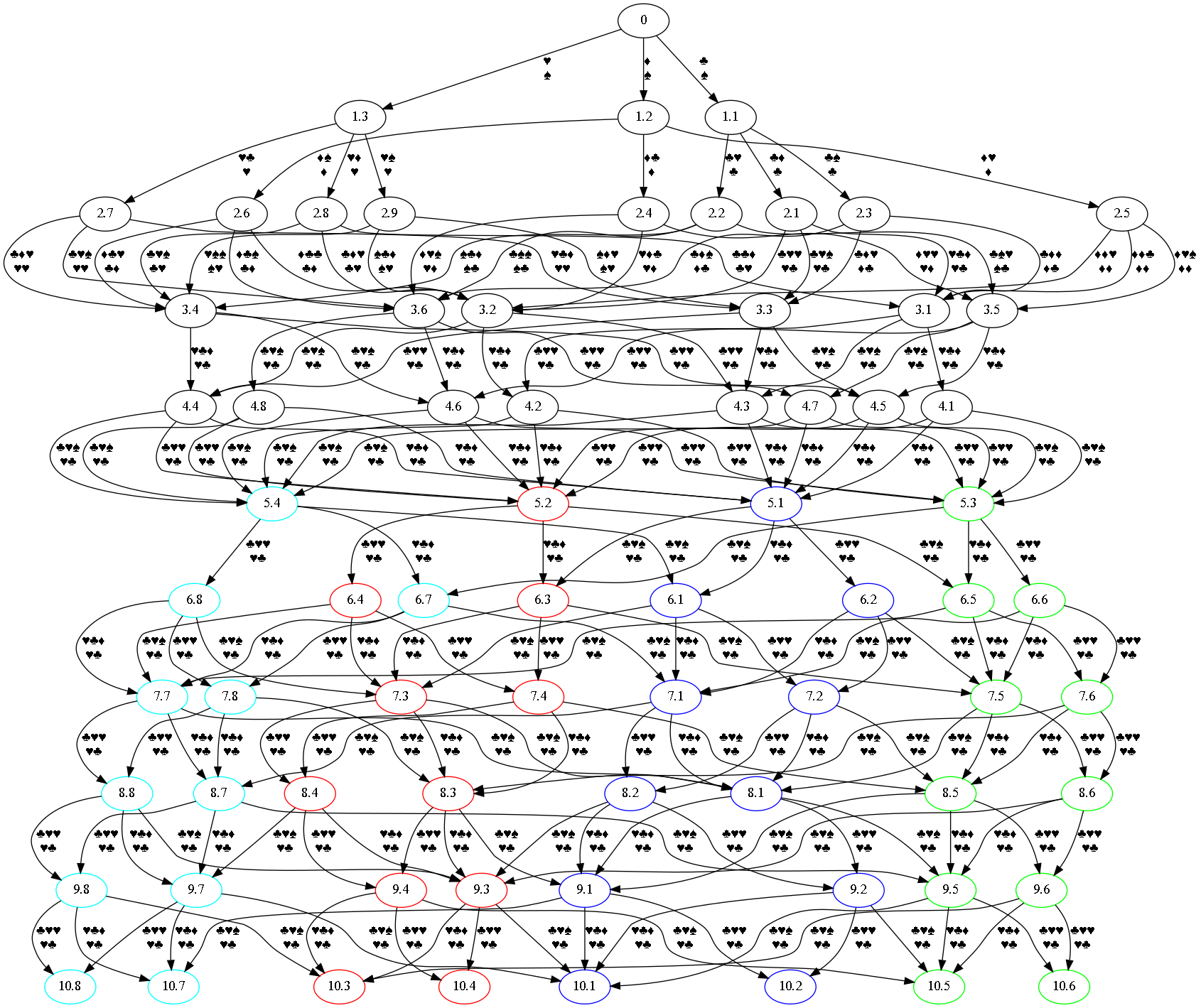 The game starts expanding, then contracting until “the big squeeze” in level 5, after which two end nodes become the most likely outcomes (render in matching colors) until the end in level 10. From level 5 to 10 is fine tuning and negotiation although switching to other pairs is possible if lots of resources are involved (not pictured in the example).
