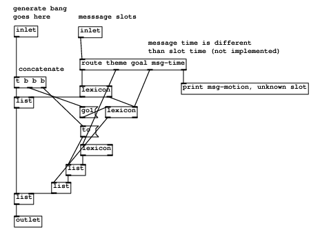 Now, how to implement NLG messages in Pd? My current solution is to have two inlets in each message patch, the hot one, just used for producing output through a bang and another receiving NLG messages split into Pd messages as mentioned before. The different attribute-value pairs are processed through a Pd route command into the lexical patches (patches that verbalize a symbol).