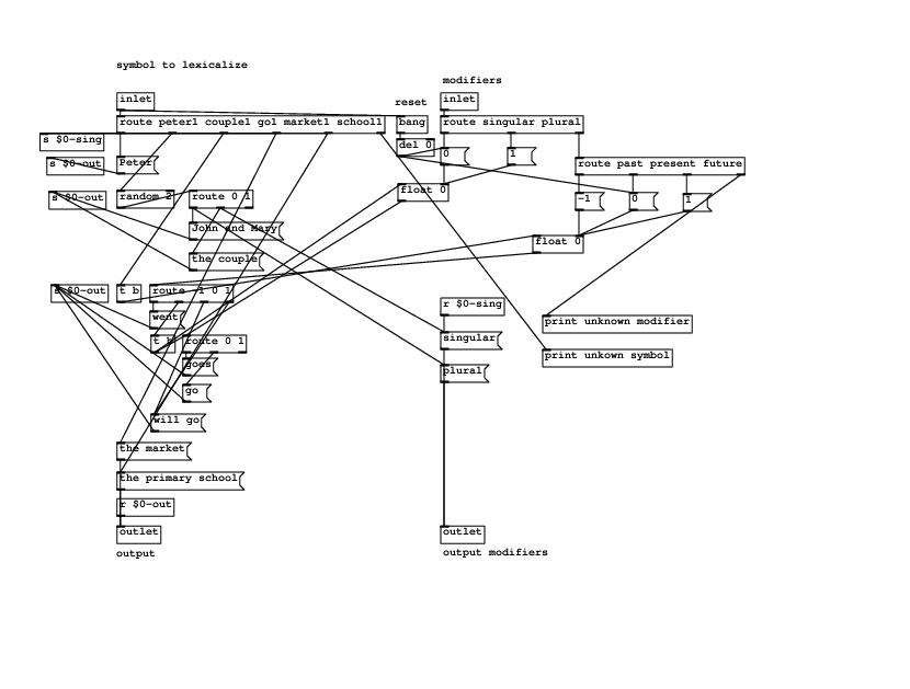 However, here we then start having to deal with the tricky aspects of NLG: exceptions and subtleties of language. For example, a concept, such as COUPLE1 can be verbalized as John and Mary but also the couple, with one verbalization being plural and the other singular, respectively. The choice of one over the other can depend on a number of factors (whether it has been mentioned before, for example) and it will affect the verb used to verbalize the full message. To capture this extra info, the lexicon has two outlets, one with the generated string and another with any further information to be passed along to other. The message patch should route the output outlet as required by the grammar (for example, in a particular verbalization for MOTION, the THEME is the subject and as such, it has to agree in number with the verb, so the its extra outlet is connected as a message input on the lexicon patch for the verb 'to go').